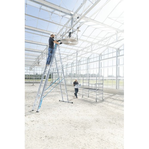 Kombinasjonsstige med høy funksjonalitet og fleksibilitet. Stiv forbindelse. Trinnsidesikring gjennom stabile perlonstropper med innsydd festeskinne. Optimalt feste for styrebeslag gjennom konstruksjon som dekker hele siden av trinnet. Løftesikring og styrebrakett er utskiftbare takket være skrukobling. Utskiftbare plastbeskyttelser for sklisikker stabilitet. Trinn og trinnsider av ekstrudert aluminiumsprofil. Oppfyller standarden SS-EN 131 professional.