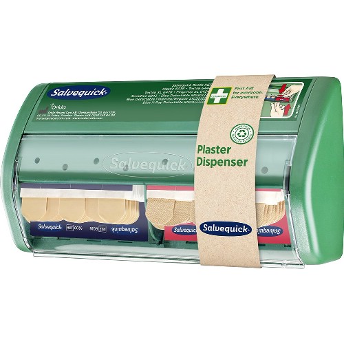 Plasterdispenser med både tekstil og plastplaster. Plastrene er allergitestet, enkle å påføre, fleksible og enkle å bruke. Med gjennomsiktig deksel som beskytter mot støv og fuktighet. Når lappen trekkes ut av dispenseren, er den ene klebeflaten eksponert og lappen er klar til påføring. Plastrene trekkes nedover fra maskinen. Maskinen lades raskt og enkelt på nytt med en spesialnøkkel. Ved etterfylling kan eventuelt lapprefill fra Salvequick settes inn.
