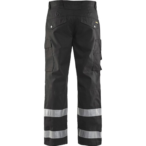 Transportbukse med forbøyde ben og mange smarte lommeløsninger. Tredelt pennelomme, ID-lomme og telefonlomme. 50 mm brede reflekser. Refleks rundt ben. Slitesterkt og vannavvisende materiale.
