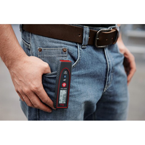 Liten og kompakt avstandsmåler som lett får plass i lommen. For raske avstands- og arealmålinger. Beskyttet mot støv og vannsprut. Opplyst display. Automatisk avstenging. Med integrert Bluetooth Smart og den gratis skisseappen Leica DISTO får du ubegrensede muligheter til å tegne skisser, lage plantegninger og dokumentere målene dine med bilder ved hjelp av en smarttelefon eller et nettbrett. Avtakbar lommeklemme.