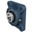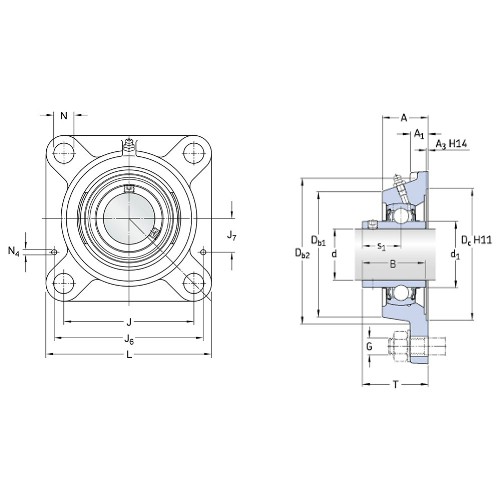 Komplett lagerenhet med innsatslager. Flenslagerhus med firkantet flens. Lagerhus laget av støpejern utstyrt med smørenippel. Innsatslager med friksjonstetning av NBR og ekstra utkasterskive på begge sider. Kan utstyres med endestykke.