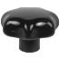 Stjernehåndtak i svart, blank termoplast. Gjenget bushing i messing.